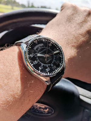 How it felt to be an early aviator, a pioneering pilot flying an airplane at the turn of the twentieth century is something that can’t be recreated, but Hamilton can give you the look - created using modern materials including stainless steel and sapphire crystal. Add an automatic movement and a perfectly proportioned 42mm case for a new take on a vintage timepiece. Stainless steel case with a black leather strap, black dial. Automatic movement. Case size 42mm. Water resistance upto 100 meters. Sapphire crystal. Pin buckle.