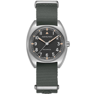 Powered by the awesome H-50 handwinding movement with 80 hours of power reserve, the Khaki Pilot Pioneer is a reinterpretation of a vintage military watch produced for the British Royal Air Force in 1973. Featuring a distinctive dial pattern and robust NATO strap, this is a military watch with real character. Stainless steel case with a grey leather strap, black dial. Case size 36mm x 33mm. Water resistance upto 100 meters. Mechanical movement. Mineral crystal. Pin buckle.
