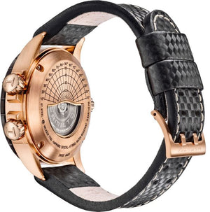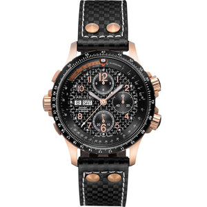 Innovative, adventurous and accurate. It's what pilots need in a timepiece and Hamilton always delivers. The Khaki X-Wind features the first ever drift angle calculator to appear in a watch and helps pilots accurately calculate how crosswinds will affect their journey. With a technical look and automatic movement that also suits urban aviators down to the ground it's the perfect everyday co-pilot. Stainless steel rose gold PVD coating case with a black leather strap, black dial. Case size 44mm. Water resistance upto 100 meters. Automatic movement. Sapphire crystal. Pin buckle.