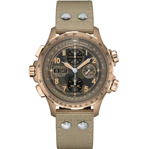 Designed with pilots in mind and built for a life of adventure, the Khaki Aviation X-Wind Automatic Chronograph flies through the crosswinds in a bold new guise, with camouflage patterns and new color variants extending across the dial, strap and case. Featuring an inner rotating bezel and an anti-magnetic Silicon hairspring, this high-performance piece has combat-chic looks and assertive style. Stainless steel beige PVD coating case with a beige textile strap, brown dial. Automatic movement. Case size 45mm. Water resistance upto 100 meters. Sapphire crystal. Pin buckle.