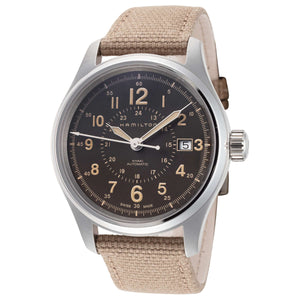 If you have high expectations when it comes to your outdoor equipment, the Khaki Field Auto is guaranteed to meet your exacting standards. With a bold military inspired look that's backed up by the strength and accuracy of the exclusive H-10 automatic movement inside the stainless steel case, this is essential equipment for your latest adventure. Stainless steel case with brown canvas strap, brown dial. Automatic movement. Case size 40mm. Water resistance up to 100 meters. Sapphire crystal. Pin backle.