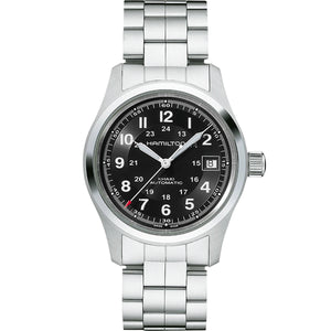 When you're planning an expedition, your essential equipment is reliable, resilient, functional and compact. At 38mm, this watch is punching above its weight when it comes to military inspired features. Bold looks, a rugged and robust case and strap and a movement that won't let you down. With 80 hours of typical power reserve in the exclusive H-10 automatic caliber, the Khaki Field Auto will keep you going. Stainless steel case and bracelet with, black dial. Case size 38mm. Water resistance up to 100 meters. Automatic movement. Sapphire crystal. Folding clasp.
