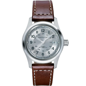 When you're planning an expedition, your essential equipment is reliable, resilient, functional and compact. At 38mm, this watch is punching above its weight when it comes to military inspired features. Bold looks, a rugged and robust case and strap and a movement that won't let you down. With 80 hours of typical power reserve in the exclusive H-10 automatic caliber, the Khaki Field Auto will keep you going. Stainless steel case with a brown leather strap, silver dial. Case size 38mm. Water resistance upto 100 meters. Automatic movement. Sapphire crystal. Pin buckle.