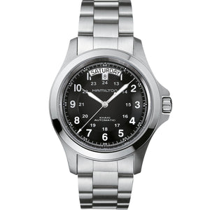 Military time features prominently on the dial of the Khaki Field King Auto, underlining the military heritage of this handsome Hamilton. Specially designed protectors ensure the safety of the crown at all times. Long live the king. Stainless steel case and bracelet with, black dial. Case size 4omm. Water resistance upto 50 meters. Automatic movement. Sapphire crystal. Folding clasp.
