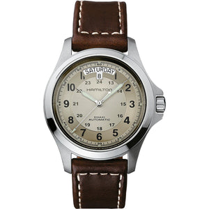 Military time features prominently on the dial of the Khaki Field King Auto, underlining the military heritage of this handsome Hamilton. Specially designed protectors ensure the safety of the crown at all times. Long live the king. Stainless steel case with a brown leather strap, beige dial. Case size 40mm. Water resistance upto 50 meters. Automatic movement. Sapphire crystal. Pin buckle.
