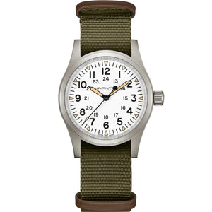 38 mm matt stainless steel case, three-hand display, white dial, triangular indexes with old radium color Super-LumiNova, durable NATO strap: The new Khaki Field Mechanical is a faithful recreation of its original 1960s forebear and is true to Hamilton’s military heritage. Inspired by the military, and built to last, this is the original soldier’s watch. Stainless steel case with green nato strap, white dial. Mechanical movement. Case size 38mm. Water resistance up to 50 meters. Sapphire crystal. Pin buckle.