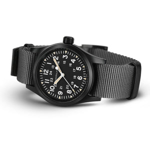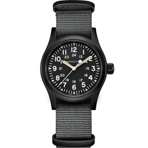 The black and gray color scheme of this Khaki Field Mechanical is a subtle approach to military styling. It is powered by the exclusive H-50 handwinding movement which is housed in a 38 mm case. Triangular indexes with old radium color Super-LumiNova and a durable NATO strap complete the package. Black PVD stainless steel case with a grey nato strap, grey dial. Mechanical movement. Case size 38mm. Water resistance upto 50 meters. Sapphire crystal. Pin buckle clasp.
