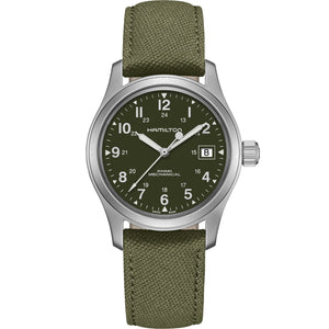 This is simplicity at its best. The Khaki Field Officer Handwinding offers basic functions and components for the no-nonsense, rugged watch wearer. Available with a choice of leather or canvas strap it is a timepiece not to be overlooked. Stainless steel case with a green canvas strap, green dial. Case size 38mm. Water resistance upto 50 meters. Mechanical movement. Sapphire crystal. Pin buckle.