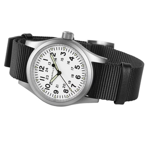 Small and mighty, the Khaki Field Mechanical is the ultimate companion when you're out in the field. Housed in a 38 mm stainless steel case, the matt white dial features contrasting black indexes and a Super-LumiNova® coating for optimal legibility. Thanks to its durable NATO strap, the Khaki Field Mechanical is a faithful recreation of its original 1960s forebear and is true to Hamilton’s military heritage.