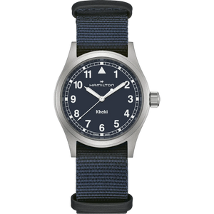The Khaki Field Quartz expresses a return to Hamilton's military heritage through simplicity in design. The dial features a clear typography with straighter Arabic numerals and a "railway" minute track. The color palette is understated, with its sleek blue dial highlighted by white Super-LumiNova® indexes. The watch comes with a blue textile NATO strap and blue leather loops - perfect for your next adventure out in the field.