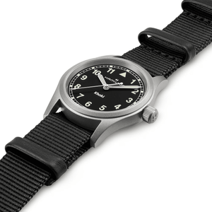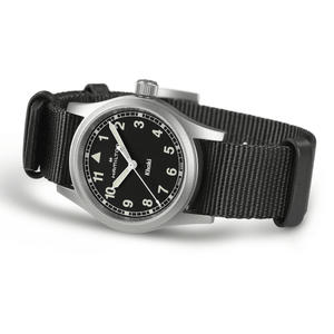 The Khaki Field Quartz expresses a return to Hamilton's military heritage through simplicity in design. The dial features a clear typography with straighter Arabic numerals and a "railway" minute track. The color palette is understated, with its sleek black dial highlighted by light green Super-LumiNova® indexes. The watch comes with a black textile NATO strap and black leather loops - perfect for your next adventure out in the field.