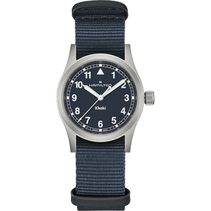 The Khaki Field Quartz expresses a return to Hamilton's military heritage through simplicity in design. The dial features a clear typography with straighter Arabic numerals and a "railway" minute track. The color palette is understated, with its sleek blue dial highlighted by white Super-LumiNova® indexes. The watch comes with a blue textile NATO strap and blue leather loops - perfect for your next adventure out in the field.