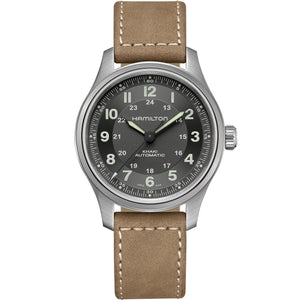 For over 100 years, Hamilton provided thousands of watches for the military. Today, we draw on that experience to create field watches for modern life. With a combination of lightweight functionality and military style, the Khaki Field Titanium Automatic is ready for action. Titanium case with a brown leather strap, black dial. Case size 42mm. Water resistance upto 100 meters. Automatic movement. Sapphire crystal. H-buckle.