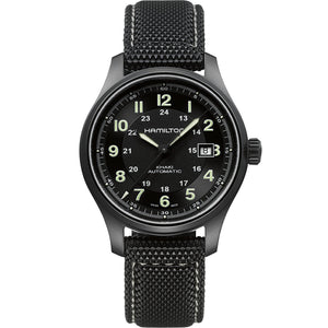 Made from lightweight titanium but definitely a functional heavyweight, the Khaki Titanium Auto does its job without fuss or fanfare. A simple, clear dial and a rubber strap make this a no-nonsense timepiece for men on a mission. Titanium black PVD Coating case with a black Canvas strap, black dial. Case size 42mm. Water resistance upto 100 meters. Automatic movement. Sapphire crystal. Pin buckle.