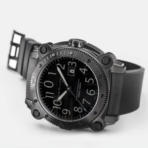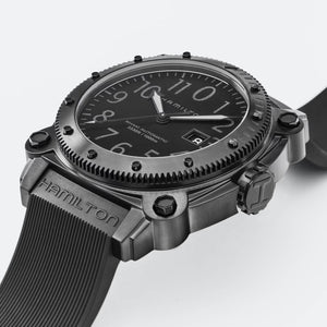Water resistant up to 100 bar (1,000 m) and equipped with a helium escape valve, the Khaki BeLOWZERO is perfect for even the most daring of deep water adventures. The convex sapphire crystal offers high-performance protection during underwater exploration and the black PVD treated 46mm stainless steel case is reminiscent of the bulk of a submarine. This Hamilton is a nautical classic designed for marine pioneers.