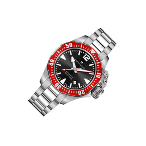 The original Hamilton Frogman was created for U.S. Naval 'Frogman' teams and featured in the 1951 smash-hit movie 'The Frogmen'. Almost 70 years have passed since then and watchmaking technology has come a long way. What hasn't changed are the vital features that made the watch as big a hit as the movie: Uni-directional rotating bezel, supreme water resistance and underwater luminescence. Stainless steel case and bracelet with black dial. Case size 42mm. Water resistance upto 300 meters. Automatic movement. Sapphire crystal. Folding clasp.