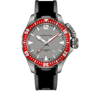 With a massive 46mm case, the Khaki Navy Frogman Titanium is a real ocean giant. Water resistant up to 100 bar (1,000m) it's built for the depths and to meet the demands of the toughest underwater environment. Made from lightweight but durable titanium and with a practical rubber bracelet, this is vital safety equipment for ocean explorers. Titanium case with black rubber strap, silver dial. Case size 46mm. Water resistance upto 1000 meters. Automatic movement. Sapphire crystal. Pin buckle.