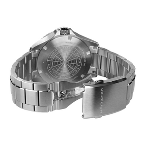 Designed for modern mariners and salty sea dogs, the Khaki Navy Automatic GMT is the ultimate traveler's watch, thanks to its precise timekeeping across multiple time zones. Boasting a stainless steel case with a brushed bracelet, the grained white dial is accented by light green Super-LumiNova® indexes, while a red hand indicates the GMT function and facilitates the unmissable reading of the second time zone. Featuring 30-bar water resistance, screw-down crown and a power reserve of up to 80 hours, the Khaki Navy Automatic GMT will ensure you dive into new horizons with confidence and style. Discover our Khaki Navy collection, made for underwater adventures.