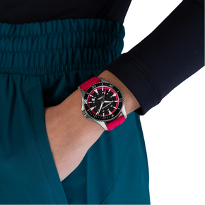 Beachside, poolside or swimming in the deep ocean, the new Khaki Navy Scuba is guaranteed to make a splash in the style stakes. For modern mariners, snorkelers, surfers and beach lovers, it’s eye-catching as well as functional, thanks to its hot pink rubber strap and contrasting black dial. Whether you’re timing your swim, your run or your time in the sun, it will make sure you keep your cool, even in soaring temperatures.