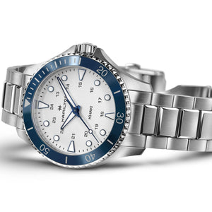 Explore in high-seas style with this Khaki Navy Scuba Quartz. The perfect summer accessory, its beautiful blue bezel shines against a white dial and protects the watch from corrosive elements like sand and salt. Stainless steel case and bracelet with silver dial. Case size 37mm. Water resistance up to 100 meters. Quartz movement. Sapphire crystal. Folding clasp.