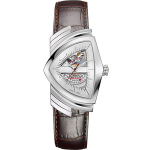 The original Ventura, launched in 1957, made watchmaking history as the world's first electrical, battery powered watch. Creating an automatic version of a watch famed for its battery powered movement is a bold move, and one that's typical of Hamilton. This model offers a glimpse of the movement inside. Stainless steel case with a brown leather strap, silver dial. Automatic movement. Case size 34.7mm x 53.5mm. Water resistance upto 50 meters. Sapphire crystal. Folding clasp.