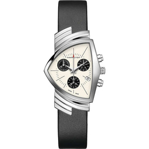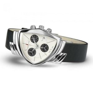 The original Ventura, launched in 1957, made watchmaking history as the world's first electrical, battery powered watch. With its daring and distinctive design, it quickly became an icon and a collector's item. Ventura's latest incarnation is a faithful tribute to the original and mirrors the pioneering shield shaped celebration of Mid-Century Modern design in a sporty chronograph model. Stainless steel case With black calf leather strap, white dial. Quartz movement. Case size 32.3mm x 50.3mm. Water resistance up to 50 meters. Sapphire crystal. Butterfly clasp.