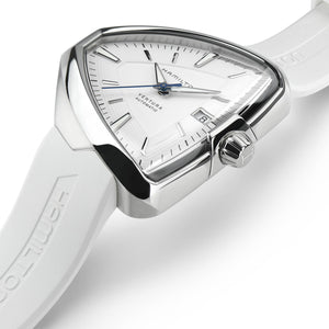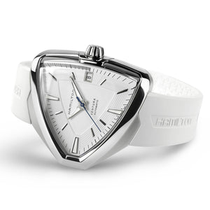 The original Ventura, launched in 1957, made watchmaking history as the world’s first electrical battery powered watch. This new version pays tribute to the ultimate rulebreaker and Ventura’s biggest fan: Elvis Presley. Classic Ventura in appearance, it features the modern H-10 movement with 80 hours of power reserve and a seconds hand that has been blued by flame. Stainless steel case with white rubber strap, white dial. Automatic movement. Case size 42.5mm x 44.6mm. Water resistance upto 30 meters. Sapphire crystal. pin buckle.