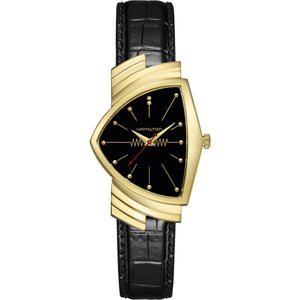 Set yourself apart with a high-end icon. Enhanced with a bold 14K yellow gold case, our Ventura remains true to its origins and its distinctive appeal, paying homage to the world’s first electric watch. Limited to 130 pieces, this design classic and our 130th anniversary emblem keeps on turning heads today. Black leather strap and black dial. Quartz movement. Case size 33.11mm x 51.63mm. Water resistance up to 50 meters. Sapphire crystal. Butterfly clasp.
