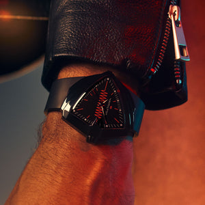 Illuminate the night with the electrifying Ventura XXL Bright and its light up dial. A symbol of innovation since 1957, the world’s first battery-powered watch continues to spark conversation decades later. Stainless steel black PVD Coating case with black rubber strap, black dial. Quartz movement. Case size 52mm x 47,6mm. Water resistance up to 50 meters. Sapphire crystal. Pin buckle clasp.