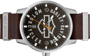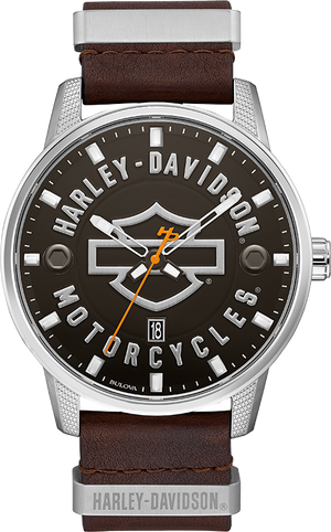 Matte black dial detailed with open bar+shield and Harley-Davidson® Motorcycle logos. Calendar feature. White luminous hands and orange second hand with signature H-D® counterweight. Stainless steel case. Screw back. Brown leather NATO strap. Case size 45mm. Water resistant up to 50m.