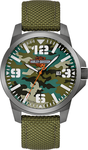 A sporty look with a nod to the involvement of Harley-Davidson® with the military. Gunmetal plated stainless steel case with a camouflage print dial. Added dimension with a double layered dial and stencil cut out markers. Resilient green Cordura nylon strap for added functionality. Luminous hands. 42mm, WR50m/165ft.