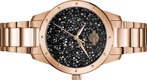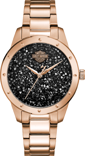Dial sparkles with black ultra-fine rock Crystals from Swarovski®. bar+shield logo at 12-hour mark. Rose gold-tone second hand with signature H-D® counterweight. Rose gold-tone stainless steel case and dimensional bracelet. Double-press short fold-over clasp. Case size 35mm. Water resistant up to 50m.