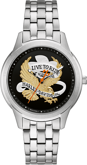 Live to ride, Ride to live. Words to live by. Stainless steel case and bracelet with black dial featuring the bold H-D® mantra. Luminous hands with the signature orange second hand. 35mm, WR50m/165ft.