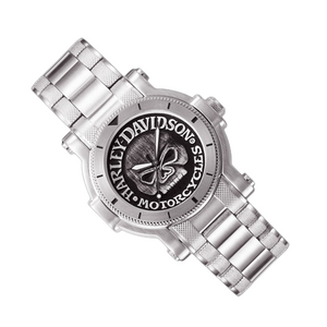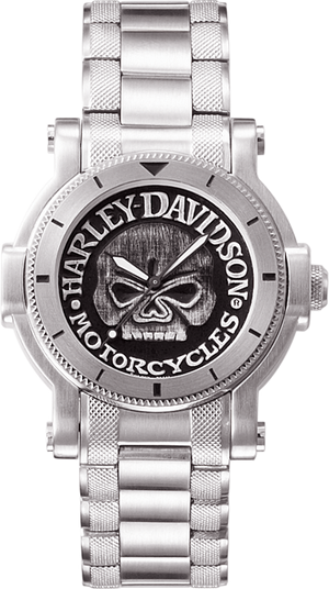 From the Signature Collection. Antiqued silver skull medallion dial. Luminous hands. Stainless steel case and bracelet. Screw back. Double press fold-over clasp with safety lock and extender. Case size 39mm. Water resistant up to 50m.