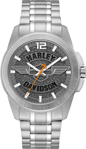 Slate grey medallion dial with open bar+shield logo and wings. Luminous hands. Orange second hand with signature H-D„© counterweight. Stainless steel case and bracelet. Snap back. Fold-over clasp with safety lock. Case size 42mm. Water resistant up to 50m.