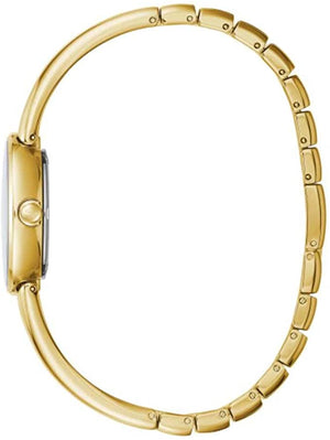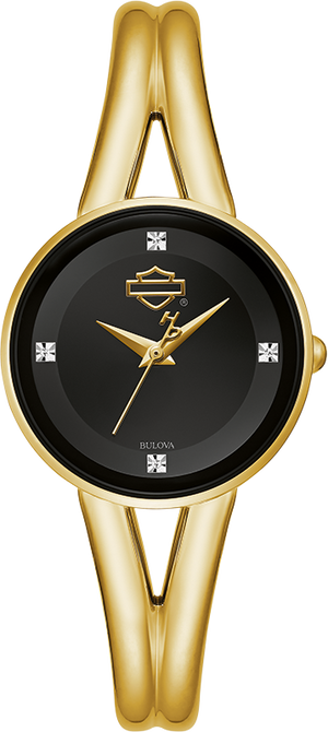 Contemporary styling. Gold-tone stainless steel case with a black dial featuring four diamonds. Domed crystal with black metallization. Gold-tone stainless steel case and bangle bracelet inspired by the pipes of a motorcycle. 30mm, WR50m/165ft.