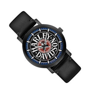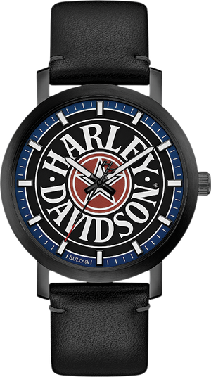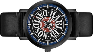 Black dial with red and blue accent colors and the iconic Fat Boy logo. Slim 6.8mm black ion-plated stainless steel case. Luminous hands and index. Black leather strap with safety stitch and three-piece buckle closure. Case size 40mm. Water resistant up to 50m.
