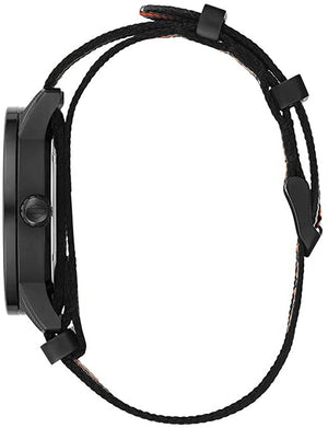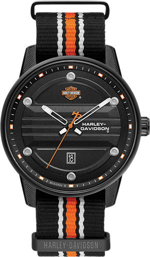 The black dial is designed to reflect a Timing cover including the bolt details. Featuring luminous hands and markers, signature orange sweep second hand, and calendar feature at the six o’clock position. Stainless steel case with black IP plating. NATO strap with signature black, orange and white stripe details. Three-piece buckle closure. 45mm, WR50m/165ft.
