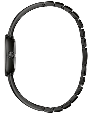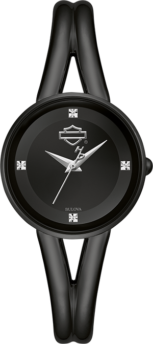 Contemporary styling. Black IP stainless steel case with a black dial featuring four diamonds. Domed crystal with black metallization. Black IP stainless steel case and bangle bracelet inspired by the pipes of a motorcycle. 30mm, WR50m/165ft.