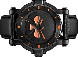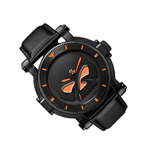 From the Signature Collection. Black dial featuring embossed skull with orange luminous eyes and nose. Orange luminous-tipped second hand with signature H-D counterweight. Orange luminous hands and markers. Stainless steel case with black ion plating. Screw back. Black leather strap. Case size 43.5mm. Water resistant up to 50m.