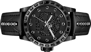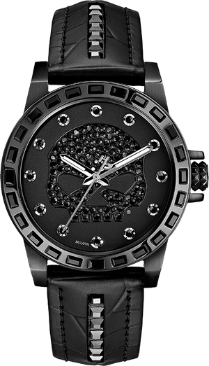 Embellished with 161 Swarovski® Crystals on skull design dial and hour markers. Jet black dial with luminous filled hands. Silver second hand with signature H-D© counterweight. Stainless steel case in black ion-plated finish. Snap back. Black crocodile-embossed leather strap with three-piece buckle closure. Case size 40mm. Water resistant up to 50m.