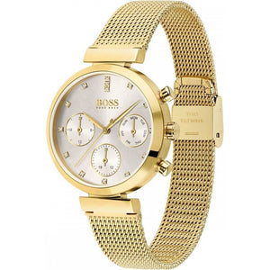 This Hugo Boss watch has a gold coated stainless steel case 36mm in diameter and is fitted with a metal strap. Inside the case lies a movement and the watch features a mineral crystal. Dial color silver, push button deployment clasp, water resistance upto 30 meters.