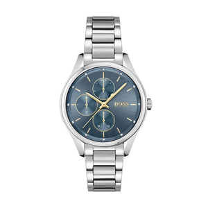 The Hugo Boss Ladies Grand Course Watch 1502583 combines a 36mm round shaped stainless steel case and bracelet with a push button deployment clasp. It has a blue analogue dial with day and date subdials and 12 sparkling crystal hour markers, which is protected beneath mineral crystal glass. Power is generated by the quartz movement. This model also has a water resistance of up to 30 metres.