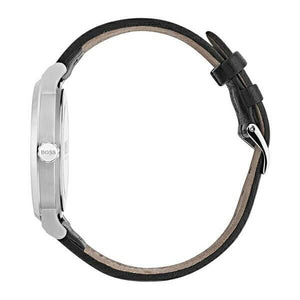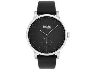 This Hugo Boss watch has a stainless steel case 42mm in diameter and is fitted with a leather strap. Inside the case lies a movement and the watch features a mineral crystal. Black dial color and strap. Traditional tangue buckle clasp, water resistance upto 30 meters.