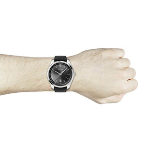 This Hugo Boss watch has a stainless steel case 42mm in diameter and is fitted with a leather strap. Inside the case lies a movement and the watch features a mineral crystal. Water resistance upto 30 meters.