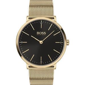 This Hugo Boss watch has a gold coated stainless steel case 40mm in diameter and is fitted with a metal strap. Inside the case lies a movement and the watch features a mineral crystal. Butterfly clasp with push buttons, water resistance upto 30 meters.