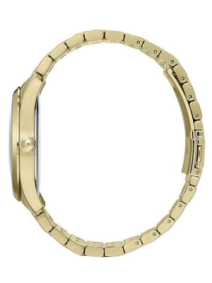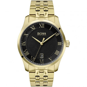 This eye catching timepiece is perfect for everyday wear. Crafted in stainless steel with a glistening gold PVD plating, the watch features a textured dial in a contrasting black. The dial is adorned with gold roman numeral hour markers and hands and is finished with Boss branding at 12 o'clock with the addition of a date window at 6 o'clock. The piece is finished with a push deployment clasp fastening for easy wear and safe removal. Case size 41mm, water resistance upto 30 meters.