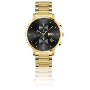 The Hugo Boss men's watch 1513781 is a true classic. The dial shows: 24-hour, chronograph, date, minute, second, hour. The high-quality stainless steel bracelet ensures a high wearing comfort. The water resistance in the amount of 3 atm, assures a good everyday suitability. A scratch-resistant hardened, mineral glass protects your new acquisition from accidental damage Case diameter: 43mm. The colors of your new 1513781: Dial: Black, Strap: Gold, Case: Gold. A watch for men who love the extraordinary from Hugo Boss.