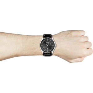 The Hugo Boss men's watch 1513794 is a true classic. The dial shows: Date, minute, second, hour. The high quality calfskin strap ensures a high level of wearing comfort. The waterproofness of 3 atm, ensures a good suitability for everyday use. One scratch-resistant hardened, mineral glass protects your new purchase from unintentional damage Housing diameter: 42mm. The colours of your new 1513794: Dial: black, strap: black, case: silver. A watch for men who love special things from Hugo Boss.