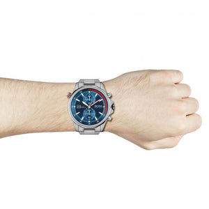The Hugo Boss Men's Watch 1513823 is a true classic. The dial shows: chronograph, date, minute, second, hour. The high-quality stainless steel bracelet ensures a high level of wearing comfort. The water resistance of 10 atm, assures a good suitability for everyday use. A scratch-resistant hardened mineral glass protects your new acquisition from accidental damage Case diameter: 46mm. The colors of your new 1513823: dial: blue, strap: silver, case: silver. A watch for men who love the special from Hugo Boss.